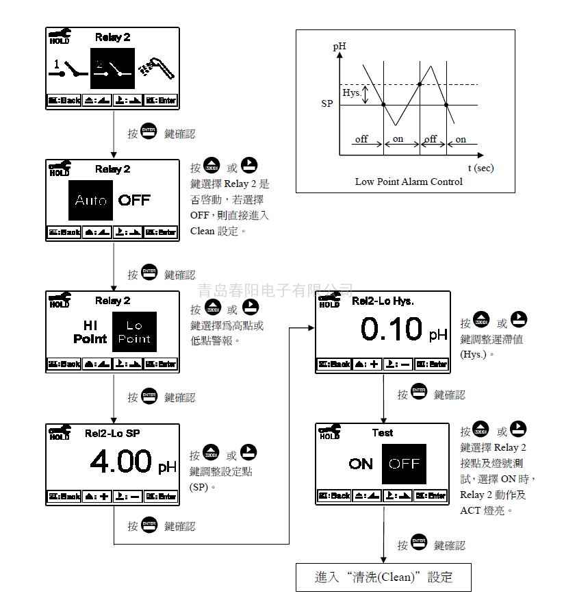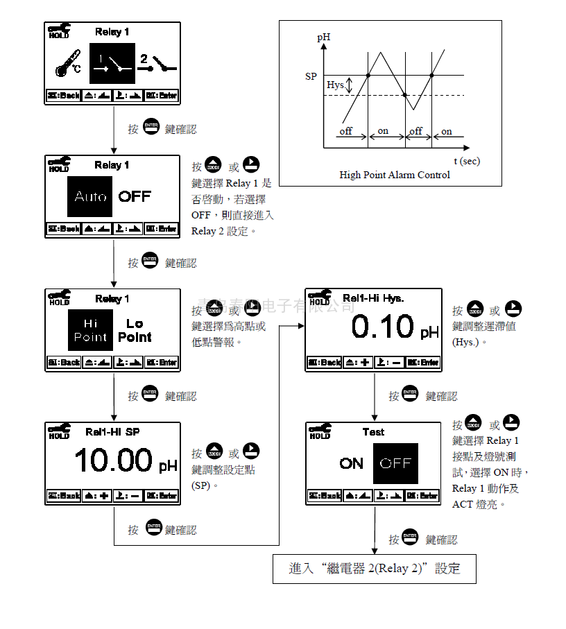 进入继电器1(Realy)选项,选择开启或关闭此功能,若选择开启,接着选择为高点(Hi Point)或低点(Lo Point)警报,输入设定点(SP, Setting Point)及迟滞值(Hys,Hysersris),各参数间的关系及意义可参考方框内的说明图(高点警报设定)进入继电器2(Realy2)选项,选择开启或关闭此功能,若选择开启,接着选择为高点(Hi Point)或低点(Lo Point)警报,输入设定点(SP, Setting Point)及迟滞值(Hys,Hysersris),各参数间的关系及意义可参考方框内的说明图(底点警报设定)