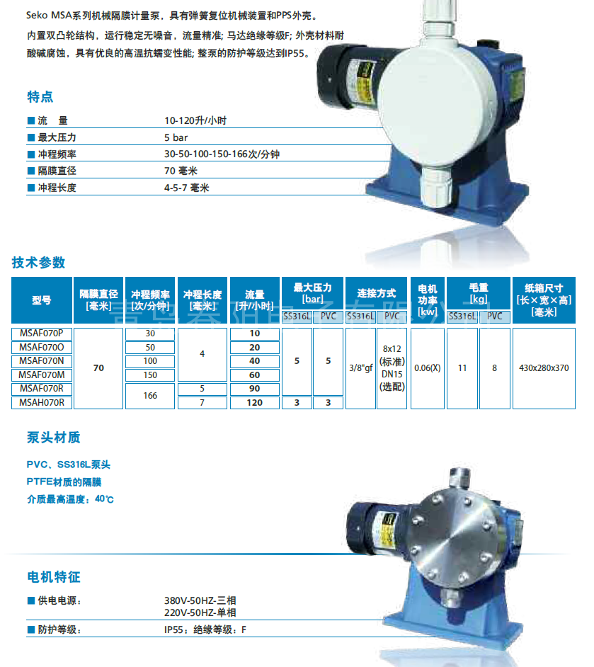 青岛机械隔膜计量泵MSA070系列SEKO机械隔膜计量泵特点: